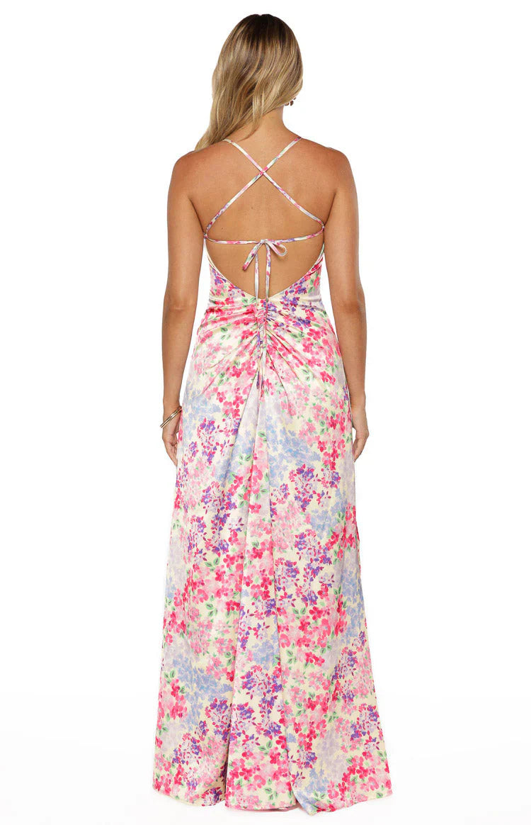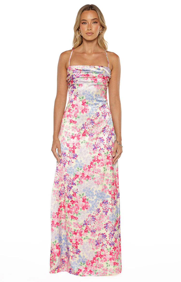 Crafted from luxe with a romantic floral print, our Blaise Multi Floral Satin Maxi Dress is designed to turn heads. Featuring a flattering gathered bust and square neckline, this maxi offers a fresh, feminine take on wear. Simply style with neutral and a matching clutch to ensure all eyes are on you.