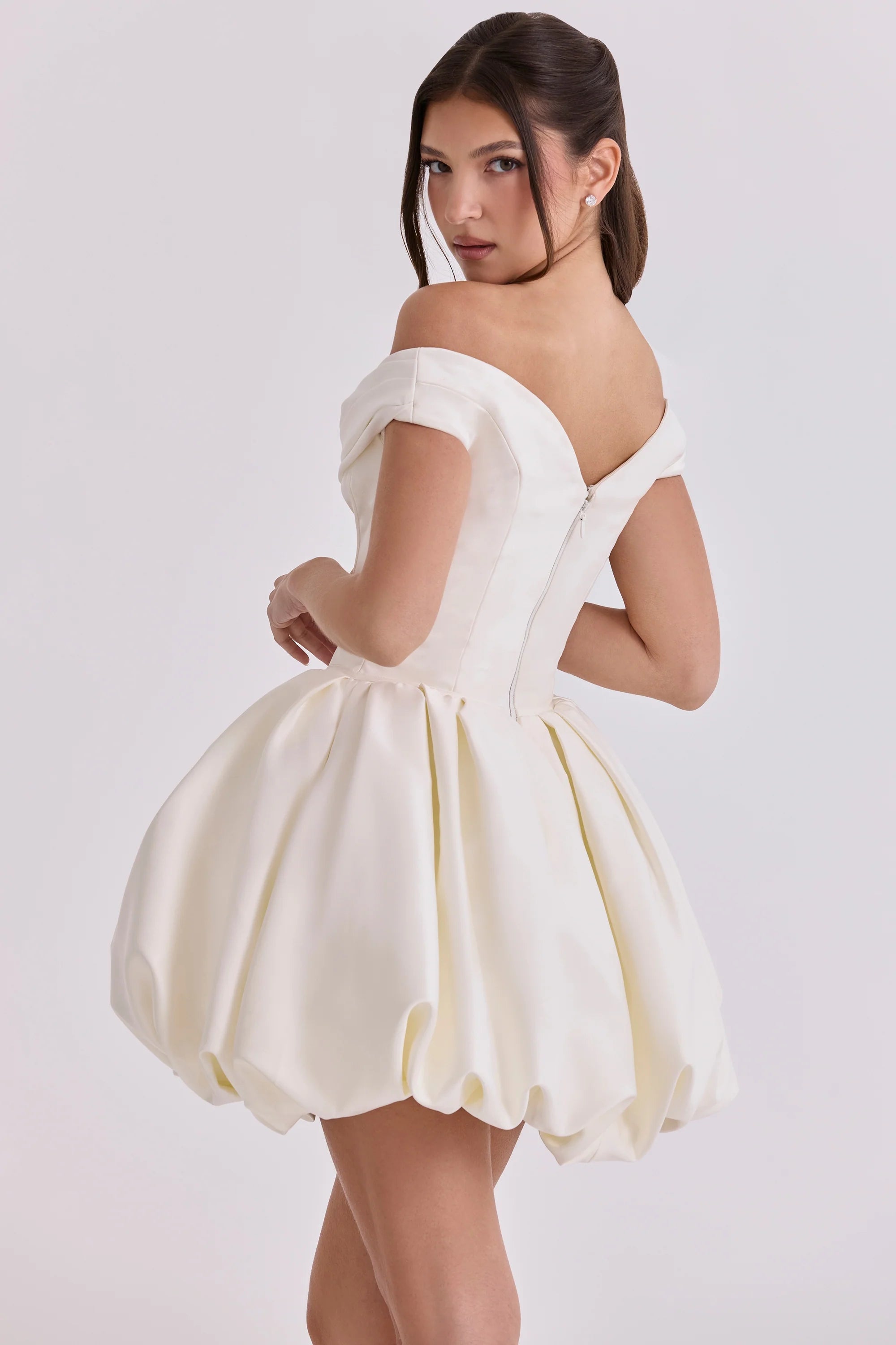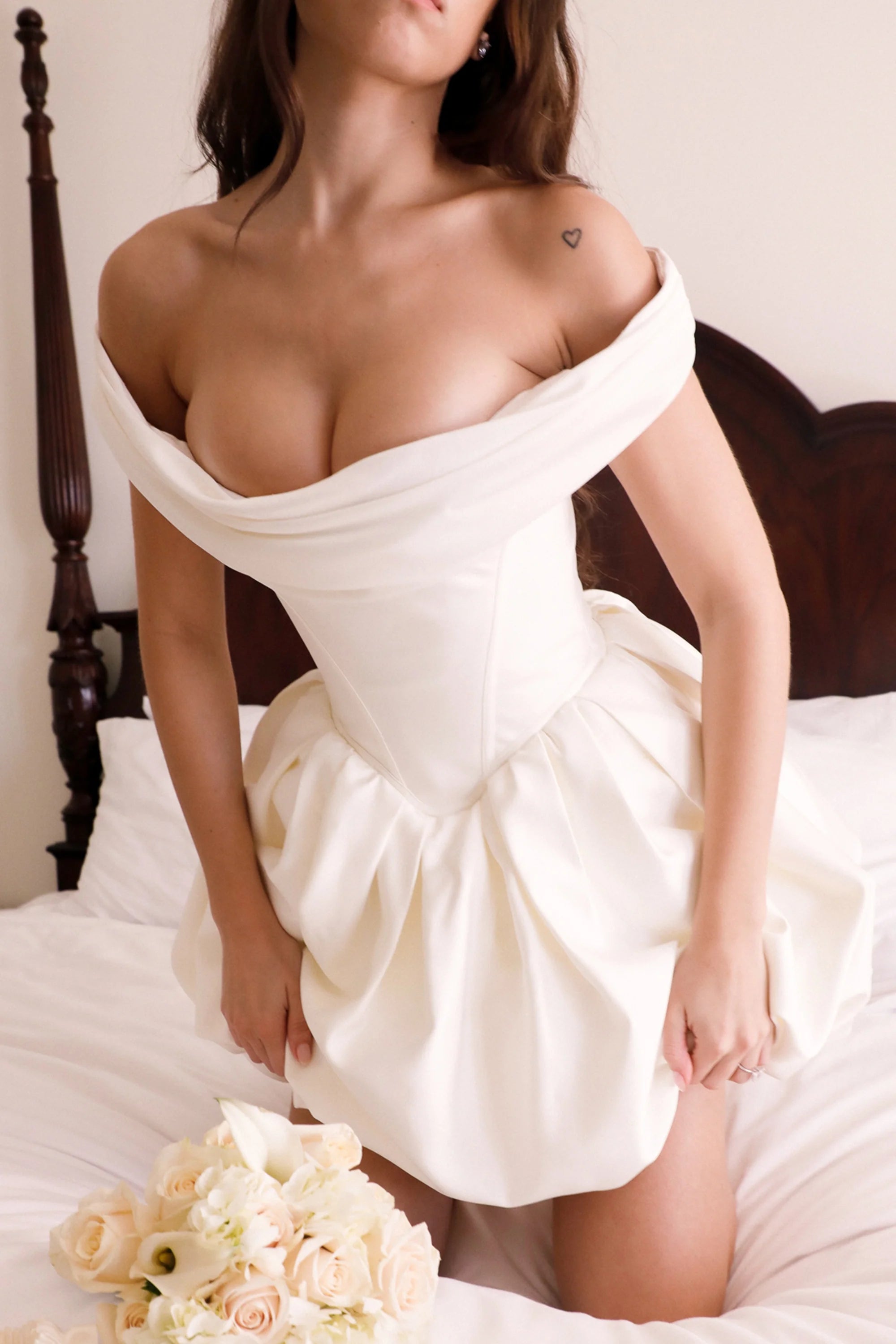 Do bridal dressing on your own terms with 'Leonora'. This gorgeous short-length gown utilises the beauty of traditional draping with a modern touch. She’s masterfully crafted from luxe ivory satin with a structured bodice that’s fully boned and fitted with hidden support that moulds to the curves of the body. This considered approach allows the décolletage to stand out with a beautifully draped cowl neckline that sits off-the-shoulder (we’ve even added extra elastic for added ease). These thoughtful design details create a look that feels effortless and quietly confident for your most romantic moments.