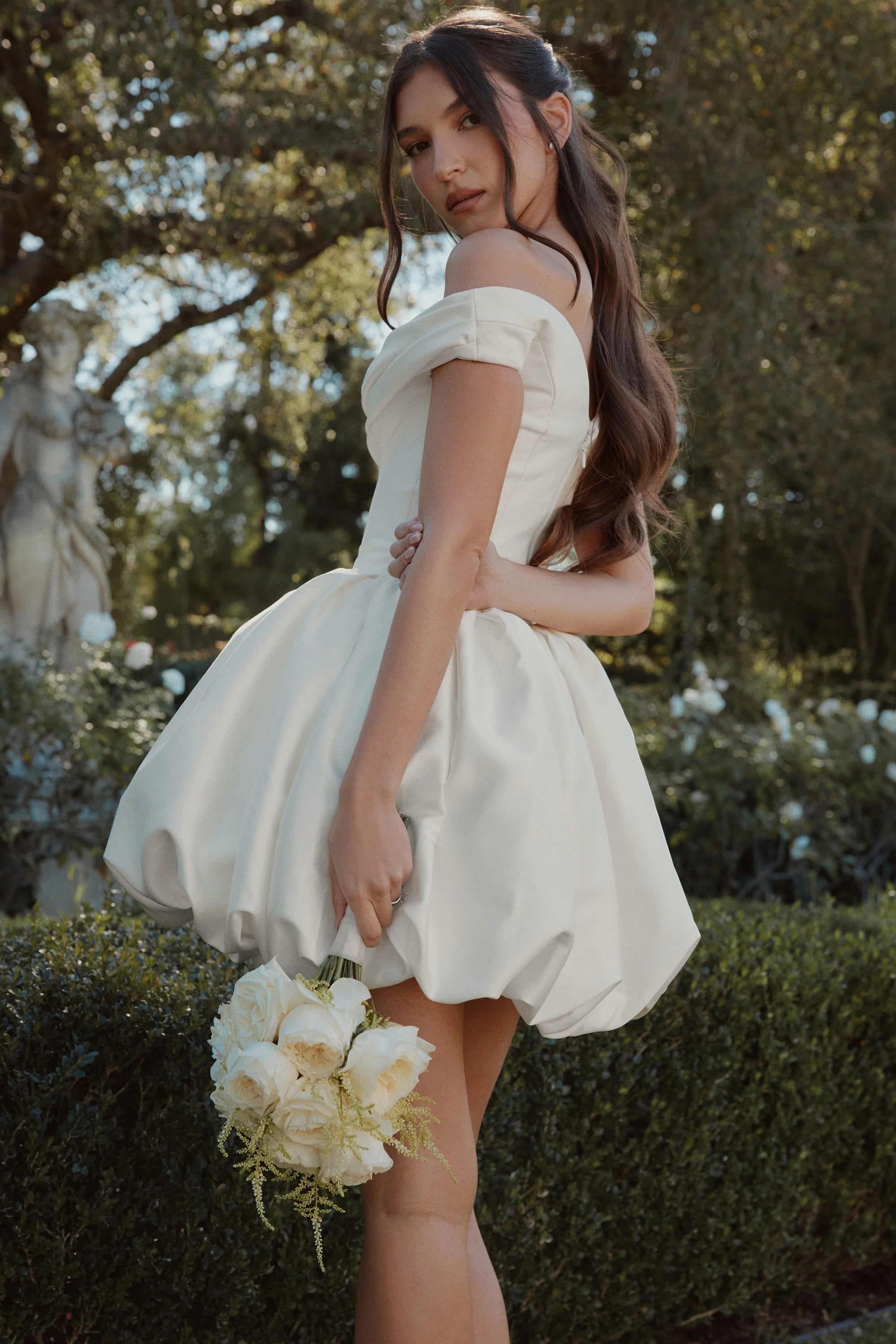 'Leonora’s shape continues to define the waist, and the statement skirt begins to flow from here blending volume, structure and fluidity. It's even got two side pockets that leave your hands free for more champagne sipping. Complete with a zip at the back, this contemporary mini gown evokes timeless beauty. She's perfect for impromptu city ceremonies, sunny wedding celebrations, your second dress option or pre-wedding parties.