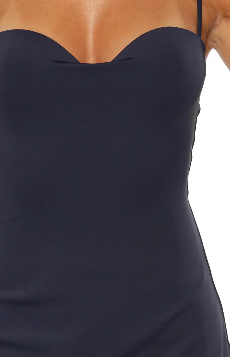 Step out in confidence wearing our Rhea Navy Mini Dress, a versatile essential for sunset drinks or casual weekend plans. Designed to flatter your curves with a comfortable stretch material, this piece highlights a sweetheart neckline and a sculpted bulit in bra cup detail. This dress is made to cinch you in with a flattering neckline. Dress it down with sneakers or elevate it with low heels for an easy day-to-night transition.